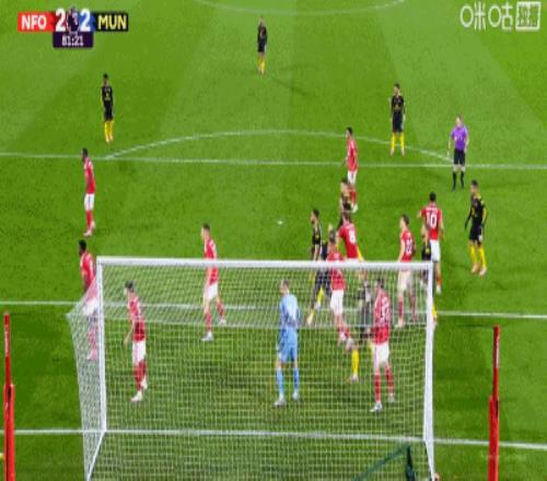 在曼联客场与诺丁汉森林的比赛进行至80分钟时,曼联客场1-2落后森林。第81分钟,曼联角球被解围到禁区弧顶处,守候在此的阿马德-迪亚洛不等皮球落地,在防守球员封堵前抢先完成凌空打门,皮球挂出一道抛物线直挂死角!