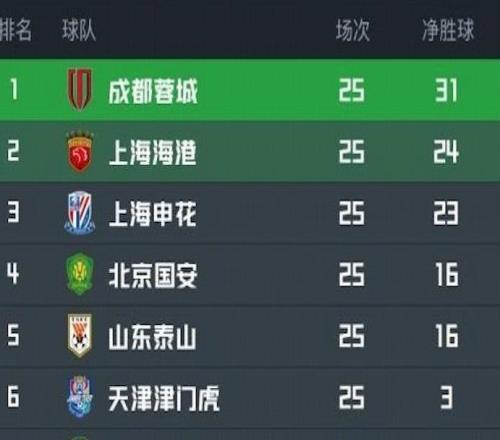 中超最新排行:蓉城退出争冠!申花升至第2,海港战平大连就夺冠